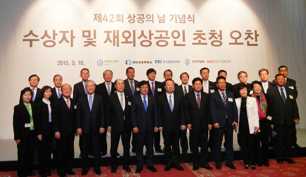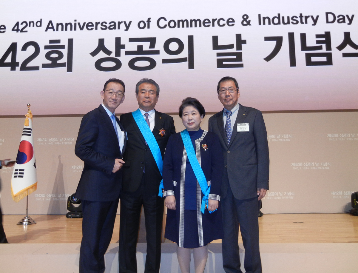 韓国の主要経済団体である大韓商工会議所、全国経済人連合会、韓国貿易協会、中小企業中央会が主催する第42回「商工の日」記念式典が3月18日、ソウルCOEXで開催され、国内外経済人1100人余りが参加して開かれました。招待を請けた在日韓商からも約50名が参加しました。本会議所からも宋玉植会長、韓勝敏副会長、天水宏常任理事などが参加しました。 記念式典では、先ずはじめに韓国の商工業の発展・変遷を映像を通じて全体で共有しました。続いて朴容晩大韓商議会長の主催に続き、記念表彰が行われ、産業勲章(10名)、産業褒章(6名)、大統領表彰(15名)などが授与されました。最高勲章である金塔産業勲章には本会と姉妹関係にある釜山商工会議所の趙成済会長(BIP会長)、現代グループの玄貞恩会長が受章されました。続いて李完九首相の祝辞、祝賀公演などが行われました。 式典後の受章者及び在外参加者午餐会が開かれ、受章者を祝うと共に各々が親睦を深めました。