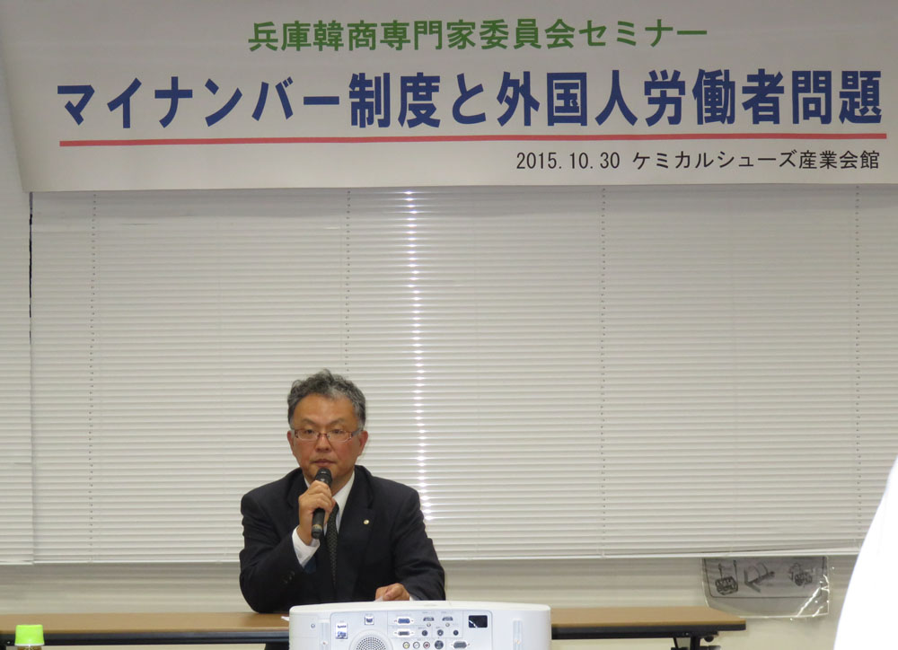 「マイナンバー制度と外国人労働者問題」開催しました(2015.10.30) 2015年11月09日 専門家セミナーには会員企業など50名が参加した。 兵庫韓商 専門家セミナー「マイナンバー制度と外国人労働者問題」開催 本会議所の専門家委員会では、「マイナンバー制度と外国人労働者問題」と題したセミナーを10月30日、ケミカルシューズ作業会館(神戸市長田区)ケミカルホールで開催し、会員企業など50名が参加しました。このセミナーは、マイナンバー制度が、来年1月1日より社会保障、災害対策などの分野で活用されるに伴い、同制度自体の説明と問題点・対応策、多くの負担がかかる会社や個人事業者の対応策、また同制度導入に伴う外国人の労務管理や労働者問題などに関して、社会保険労務士の高龍弘先生(社労士事務所アジール代表、兵庫韓商理事)から説明を受け、熱心に調光しました。 講師・高龍弘 社会保険労務士(社労士事務所アジール代表) 熱心に聴講する参加者