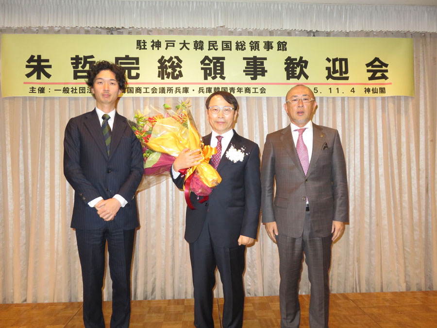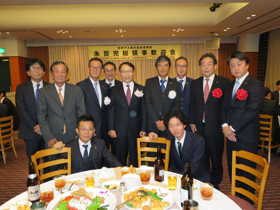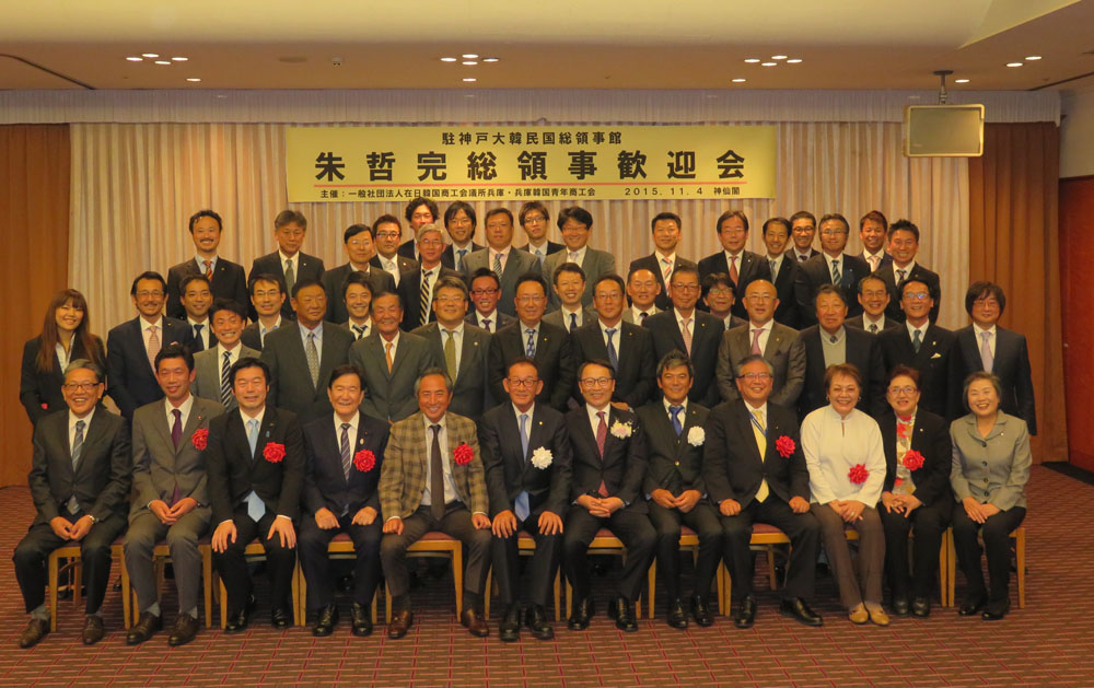 韓商・青商共催「朱哲完 駐神戸総領事 歓迎会」を開催しました(2015.11.4) 2015年11月09日 来賓、韓商・青商メンバーなど約70名が朱哲完総領事の赴任を祝った 兵庫韓商・兵庫青商共催 神戸韓国総領事館 朱哲完総領事歓迎会 本会議所では兵庫青商(金煥太会長)と共催し、今年10月に着任された朱哲完(チュ・チョルワン)駐神戸総領事の「歓迎会」を11月4日、神仙閣(神戸市中央区)で開催しました。 朱哲完総領事は、1986年に外交部に入部後、駐ラスパルマス総領事館、駐エスサルバドル大使館、駐スペイン大使館などで外交官として勤務されました。日本にも駐札幌総領事館、駐日大使館に勤務され、本年10月10日に神戸総領事として着任されました。 歓迎会には、山本敏信・日韓親善兵庫県議連会長、山本じゅんじ日韓友好神戸市議連理事、崔鐘太(一社)在日韓商名誉会長、李静子民団兵庫本部議長、金節子婦人会兵庫本部副会長、文英壽青年会兵庫本部会長などの来賓をはじめ、韓商・青商役員など約70名が参加しました。 歓送会では、宋玉植韓商会長、金煥太青商会長が主催挨拶を述べました。宋玉植会長は挨拶で朱哲完総領事の赴任を歓迎すると共に、「兵庫県内の在日企業の特徴は、遊技業や不動産業は勿論、尼崎や宝塚などの阪神地域では建設業、神戸ではケミカルシューズ産業、姫路などの西播地域では、金属加工、リサイクル業と地域別に分かれています。是非、朱哲完総領事も在任中に、産業視察・企業視察などを行って頂きたいと思います。地域経済と同胞経済の歴史と実態をご理解して頂き、今後の発展に向けて韓国政府代表として様々なご指導とご支援をお願いします」と述べました。 続いて来賓紹介並びに朱哲完総領事のプロフィール紹介に続き総領事から挨拶があり、歓迎会を催してくれた事への謝辞と共に、今後、兵庫韓商・兵庫青商活動への積極的な支援と共に、兵庫県内の同胞社会並びに同胞経済の発展、更に韓日親善・友好関係の発展に向けて尽力すると述べられました。 続いて韓勝敏副会長の乾杯音頭により歓談に入りました。歓談では朱哲完総領事が全てのテーブルを回り参加者との名刺交換や記念撮影等を行うなど和気藹々とした雰囲気の中での歓迎会となりました。 朱哲完総領事(中央)へ花束贈呈する辛輝浩副会長(右)、宋英鎬青商副会長(左) 左から崔鐘太在日韓商名誉会長、山本敏信日韓親善兵庫県議連会長、宋玉植会長、釜谷研造兵庫県議連副会長、朱哲完総領事、原吉三兵庫県議連副会長、金煥太青商会長、加田裕之兵庫県議連事務局長、山本じゅんじ日韓友好神戸市議連理事 前列左から朴康夫副会長、原吉三県会議員、朱哲完総領事、加田裕之県会議員、郭基東領事、後列左から洪大重青商副会長、朴先哲副総領事、韓勝敏副会長、洪成圭青商直前会長 前列左から朴大樹青商監事、宋英鎬同副会長、後列左から豊島英明神戸市国際交流課長、金光副会長、宋玉植会長、石田勝則兵庫県国際交流課長、朱哲完総領事、金煥太青商会長、趙珉一副会長、高山昌浩近産信組神戸支店長、田中宗彦同長田支店長