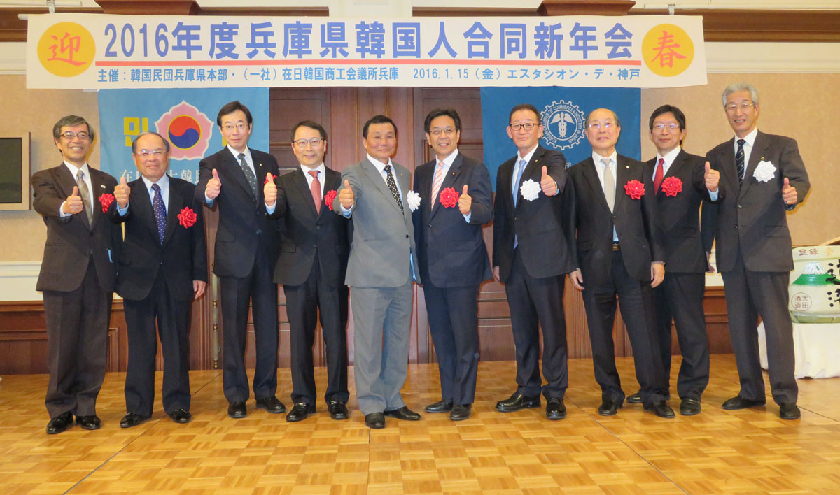 当会議所では民団兵庫本部と共催し1月15日、「2016年度兵庫県韓国人合同新年会」をエスタシオンデ神戸で開催しました。 当日は来賓として朱哲完総領事、金澤和雄兵庫県副知事、久元喜造神戸市長、西村康稔衆議院議員(自民党)、水岡俊一参議院議員(民主党)、山本敏信日韓親善兵庫県議会議員連盟会長(他、県議連所属県会議員12名)、吉田謙治日韓友好神戸市会議員連盟会長(他、市議連所属市会議員25名)、寺崎正俊兵庫県日韓親善協会長、新井康夫日本ケミカルシューズ工業組合副理事長、鮑悦初神戸華僑総会会長、ラム・カラニ在日インド商業会議所名誉会頭、徐明夫近畿産業信組副理事長、木村誠也SBJ銀行神戸支店長など約110名のご来賓の参席とともに、主催団体メンバーなど総勢300名が参加して盛大に開催しました。 新年会は、“K-POP 注目度№1”の5人組男性ダンスヴォーカルグループ「ALL STAR(オールスター)」のオープニングで幕を開け、主催者を代表して李圭燮団長、宋玉植会長の拶に続き、大統領新年辞(朱哲完総領事代読)、久元喜造市長、金澤和雄副知事、水岡俊一参議院から心温まるご祝辞を頂戴しました。続いて来賓紹介と主催代表とゲストによる鏡割りの後、寺崎正俊日韓親善協会長の乾杯により歓談に入りました。歓談では参加者各々が新年の挨拶を交わすとともに懇親を深めました。またオープニングに続き「オールスター」からミニ公演も行われるなど和気藹々とした中で楽しいひとときと新年の門出を祝いました。