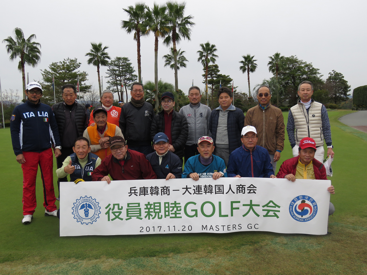 【役員親睦ゴルフコンペ】 前列左から宋玉植名誉会長、崔龍洙大連名誉 会長、朴シノン同会長、辛輝浩会長、文ソンミ ン大連諮問委員長、朴鍾薰同名誉諮問委員、 後列左から金光治副会長、大西康博副会長、 韓勝敏副会長、鄭昌鎬大連直前会長、李剛士副 会長、柳鍾輝大連主席副会長、黄成淵同諮問 委員、趙珉一副会長