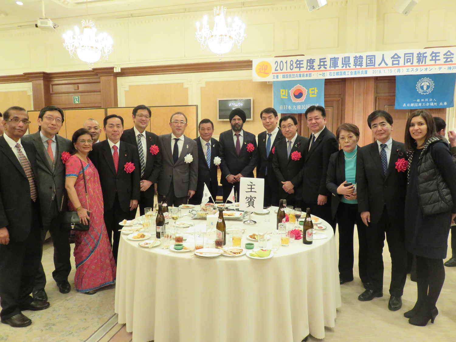去る1月15日、本会議所では民団兵庫県本部(李圭燮団長)と共催で、2018年の新春の門出を祝う「兵庫県韓国人合同新年会」をエスタシオンデ神戸にて開催しました。この合同新年会は1997年から開催し今回で21回目となります。 当日は、来賓として朱哲完駐神戸総領事、金澤和夫兵庫県副知事、玉田敏郎神戸市副市長、朴義淳在日韓商代表理事、寺崎正俊日韓親善協会会長、新井康夫日本ケミカルシューズ工業組合理事長、パラムジットチャダ在日印度商業会議所名誉副会頭、沼田伸彦㈱サンテレビジョン社長、桃田武司㈱ラジオ関西社長、大国正美神戸新聞社取締役などが参加しました。また国会議員からは盛山正仁衆院議員(自民党)、赤羽一嘉衆院議員(公明党)、中野洋昌衆院議員(公明党)、桜井周衆院議員(立憲民主党)、清水貴之参院議員(維新の会)など10名(代理含)、兵庫県会議員からは釜谷研造日韓親善兵庫県議連副会長(自民党)、原吉三議員(議連副会長、自民党)、谷井いさお議員(議連理事、公明党・県民会議)、越田浩矢議員(議連理事、公明党・県民会議)など14名、神戸市会議員からは吉田謙治日韓友好神戸市議連会長(公明党団長)、守屋隆司議員(議連副会長、自由民主党)、平木博美議員(議連事務局長、民進こうべ)、山本じゅんじ議員(議連理事、日本共産党)、など約27名など総勢330名が参加しました。 新年会は、日本で活躍中のK-POP歌手・WONWOO(ウォヌ)さんによるオープニング「会いたい」(ドラマ天国の階段主題歌)で幕を開けました。続いて主催者を代表して李圭燮団長、辛輝浩会長の挨拶があり、続いて大統領新年辞(朱哲完総領事代読)と金沢副知事、玉田副市長から心温まる祝辞を頂戴した後、主催代表とゲスト等による鏡割り、そして寺崎正俊日韓親善協会長の乾杯により歓談に入りました。歓談では各々が新年の挨拶や懇親を深めるとともに、K-POP歌手・WONWOO(ウォヌ)さんによるゲスト公演を楽しむなど和気藹々とした雰囲気の中、全体で新年の門出を祝いました。