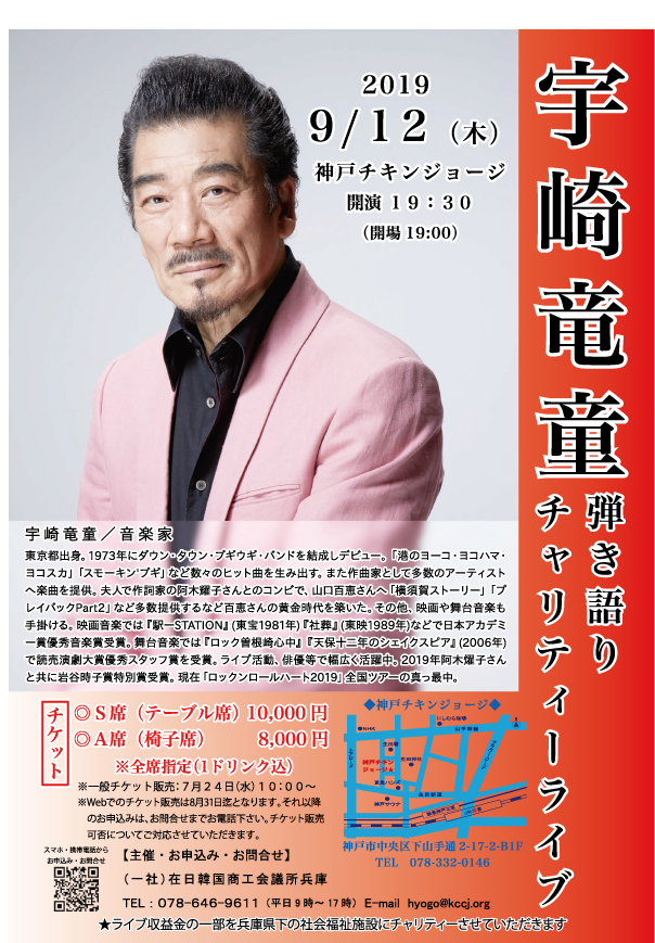 私ども兵庫韓商では、兵庫県下の社会福祉施設を支援することを目的に、元ダウンタウンブギウギバンドのリードボーカル・宇崎竜童氏を招いて「弾き語りチャリティーLIVE」を開催致します。