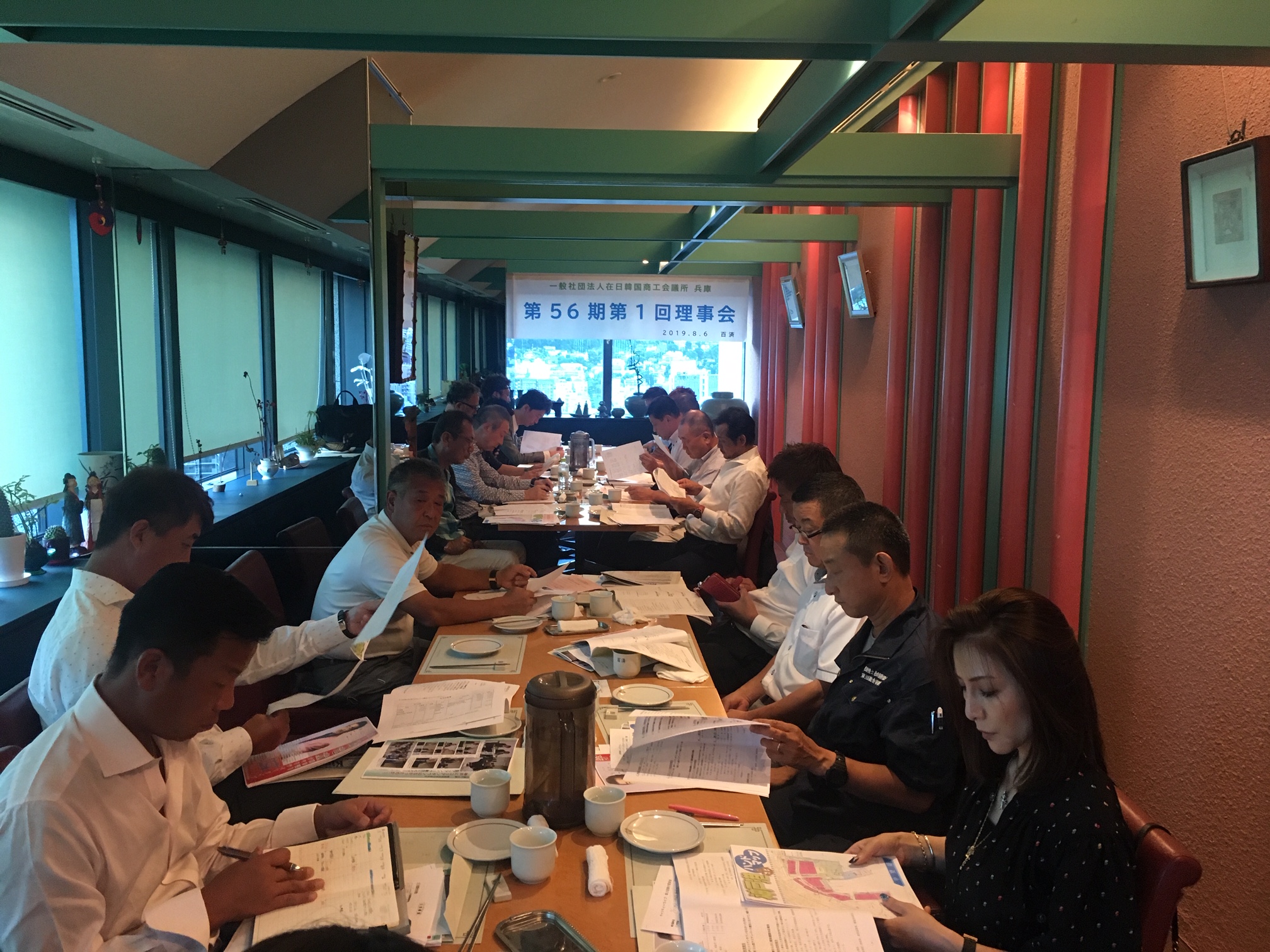 第56期第1回理事会を8月6日、神戸市役所24階の展望ロビー階で会員企業が経営する韓国料理「百済」(神戸市中央区)で理事定数28名中20名が参加して開催しました。
