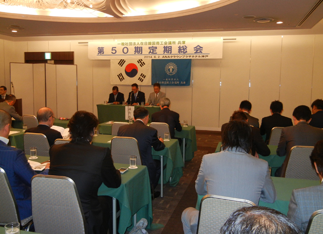 「第50期定期総会」を6月2日、ANAクラウンプラザホテル神戸で開催しました。 総会では、第一号議案「2013年度事業報告承認の件」(第1号議案)、第2号議案「2013年度収支決算書承認の件」、第3号議案「2014年度事業計画案承認の件」、第4号議案「2014年度予算案承認の件」を採択・審議した結果満場一致で承認しました。また「役員人事の件」(第5号議案)では、宋玉植会長の再任を満場一致で承認しました。監事人事は金埈兌監事、原田兼嗣監事の再任を承認、また執行部人事に関しては基本留任することとし、顧問・相談役陣等に関しては会長一任で承認しました。