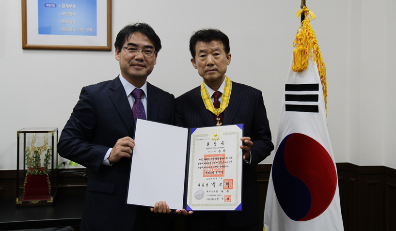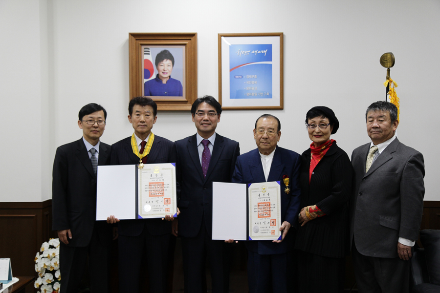 李相埰常任顧問が勲三等「冬栢章」受章 2014年11月07日 勲三等「冬栢章」受章された李相埰常任顧問(右) 2014年度国家有功者表彰で李相埰常任顧問(民団兵庫常任顧問) 勲三等「冬栢章」受章されました。 2014年度国家有功者表彰が発表され、本会議所の李相埰常任顧問(民団兵庫本部常任顧問、在日韓国奨学会顧問)が勲三等「冬栢章」を受章されました。去る10月28日、駐神戸韓国総領事館で受勲伝達式が執り行われ、朴槿惠大統領の代理として李成權総領事から李相埰常任顧問に冬栢章が伝達されました。栄えある受勲を心からお祝い申し上げます。 左・李成權総領事、右・李相埰常任顧問 左から朴先哲副総領事、李相埰常任顧問、 李成權総領事